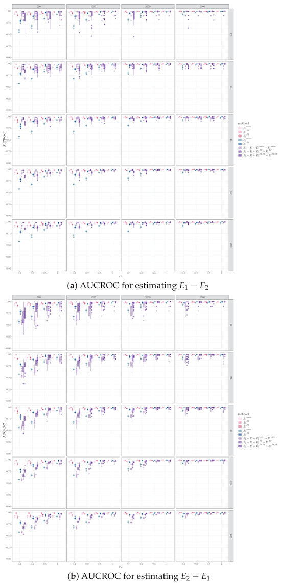 Furthermore, given the difference in sample sizes for the two data samples, the performance for identifying is different compared to that for . Specifically, comparing Figure 3a,b, for a fixed sample size ratio , the AUCROC for is higher than that of , for the naive and bootstrap methods. The advantage for diminishes as increases. For the equal sample size resampling method, the AUCROC for is generally lower than that of , except for the smaller sample size with lower . This is likely due to the fact that the equal sample size resampling method on reduces the identification of true positive edges in , which decreases the AUCROC for .