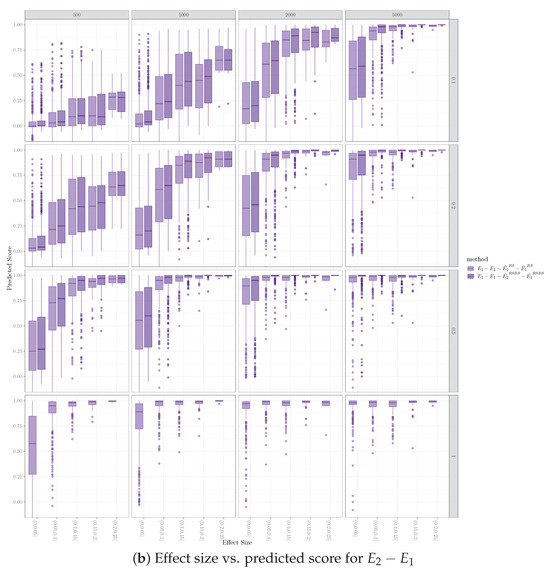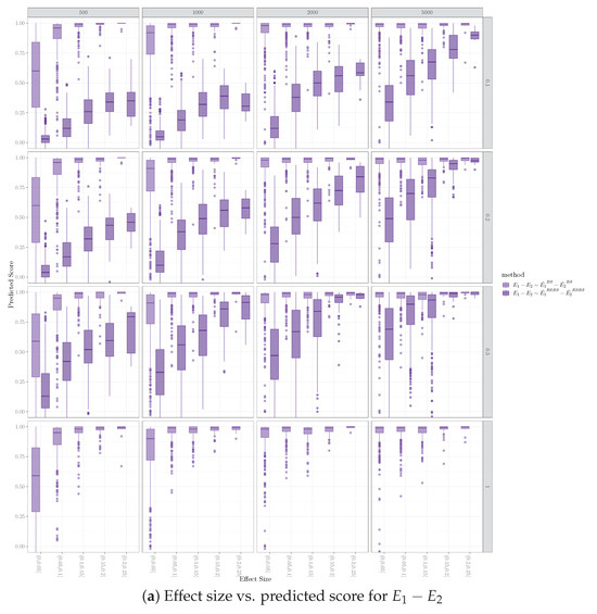 In general, the stronger the direct causal relationship among two variables in the true network, the easier it is to identify the relationship. Recall the example shown in Figure 1 and Table 1: edge A—C is difficult to discover at a smaller sample size when compared to B—C, due to the weaker edge strength. The strength of the direct causal relationship is often referred to as the effect size. To examine the influence of effect size on the performance for identifying network differences, we correlated edge effect sizes with the heuristic scores from the bootstrap and equal sample size resampling. The effect size for edge is defined as , where denotes the set that contains all parents of Y in . is interpreted as the additional information in X regarding Y, given other parents of Y [47].