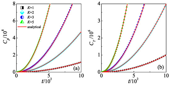 In order to confirm our above theoretical predictions, we numerically calculate both the and for different Ks. Our results demonstrate that for a specific K (e.g., in Figure 1), both and increase unboundedly with time. Furthermore, the larger the K, the faster they increase, following perfectly with the relations described in Equations (2) and (3). The continuous, unsaturated growth of OTOCs is attributed to the delocalization mechanism under quantum resonance conditions. When the delocalization mechanism is absent, the process of dynamical localization in quantum non-resonance conditions leads to the saturation of OTOCs, which has been reported in our previous investigation in Ref. [27]. It is noteworthy that the dependency of on the parameter offers a means of manipulating quantum scrambling by adjusting the translation operator, shedding light on the quantum control of non-Hermitian Floquet systems.