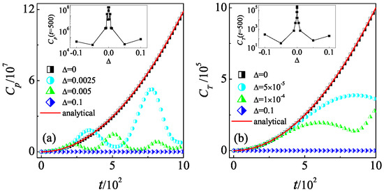 In the atom-optics realization of the QKR model, the experimental constraints in practice often introduce very small detuning from the exact quantum resonance condition [66]. We further consider the effects of the slight variation in the value of from quantum resonance condition, i.e., on the quantum scrambling. In this situation, there is a fictitious classical limit in which the parameter plays the role of the effective Planck’s constant [66,67]. We should note that traditional definition of the semiclassical limit with tending to zero does not make sense for the resonance case as . Our numerical results show that for a specific (e.g., in Figure 2a), the follows the quadratic growth of for finite time duration, i.e., , after which it fluctuates around a saturation level. Interestingly, the saturate level decreases with the increase in . For sufficiently large (e.g., ), the remains almost at its initial value and does not increases with time. We further investigate the at a specific time for different . The inset in Figure 2a shows that the decreases with some fluctuations as the absolute value of departs from zero, which demonstrates the suppression of OTOCs by the variation of from quantum resonance condition. The time evolution of also exhibits the reduction from the quadratic growth in with the increase in (see Figure 2b). When the increases from zero, the QKR transitions to the quantum non-resonance regime, where the mechanism of dynamical localization suppresses the growth of OTOCs [27].