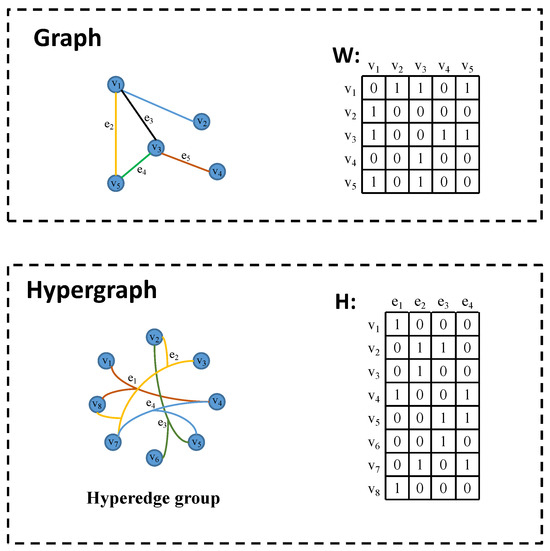 Figure 7, traditional graph structures allow each edge to connect only two vertices, representing a pair-wise association between data elements. In contrast, the hypergraph structure employs infinite hyperedges to encode higher-order data correlations. Each hyperedge can connect two or more vertices, thereby encompassing richer data information. It is worth noting that a simple graph can be considered as a special case of a hypergraph. Furthermore, when dealing with multi-modal or heterogeneous data, multi-modal data can be fused by connecting hypergraph adjacency matrix