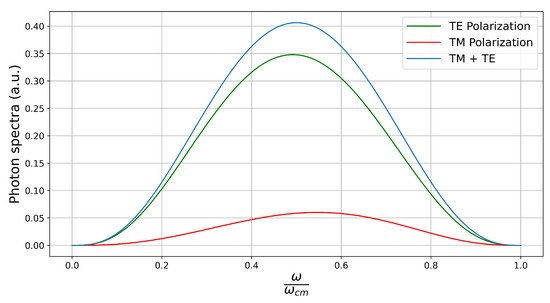 as expected since the results for TM and TE polarizations must coincide in this limit. Low-frequency photons are mostly emitted perpendicularly to the motion (