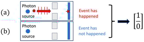 As none of these individual observations form neither an angular distribution of scattering events, nor a diffraction pattern, nor a particle trajectory, the observation of each of these individual events does not yield any other information other than that that an event has happened at a certain space–time location or not. As observation or lack of observation of a single event within an observational time interval decides a simple yes/no alternative, each of these single events has a cognitive value of exactly one bit. This idea of making an elementary observation and of choosing between binary alternatives is pictorially represented in Figure 4. There, a photon is sketched that is moving from the source towards a fluorescent screen through a narrow gap. As, on its way from the source to the fluorescent screen, no observation can be made that would allow us to decide whether the photon is moving along a straight-line particle trajectory or in an undulatory manner as a wave, the observation of a single light flash on a fluorescent screen does not allow any other conclusion to be drawn other than that that an event has happened.