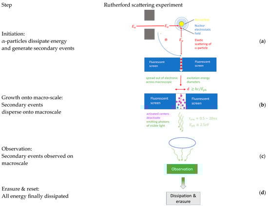 With this situation in mind, the amount of physical action , associated with such green-light-emitting cylindrical volumes (Figure 5c), can be estimated. Assuming that each ionization event ultimately leads to the emission of a green-light photon with an energy of [1] and a luminescence lifetime of [32], a piece of physical action of is generated which amounts to a quantity of 3.5 units of the Planck constant. With a physical action of only 7 units of Planck constant generated in the initiating scattering process, a huge amount of amplification on the order of is inferred to have occurred in the Geiger–Marsden experiment [1]. With this number in place, the macroscopic observability of the initiating microscopic scattering events can be explained. As, finally, after observation, all luminescence light is converted into low-temperature heat (Figure 5d), all of the α-particles’ initial kinetic energy has ultimately been dissipated in the detection process.