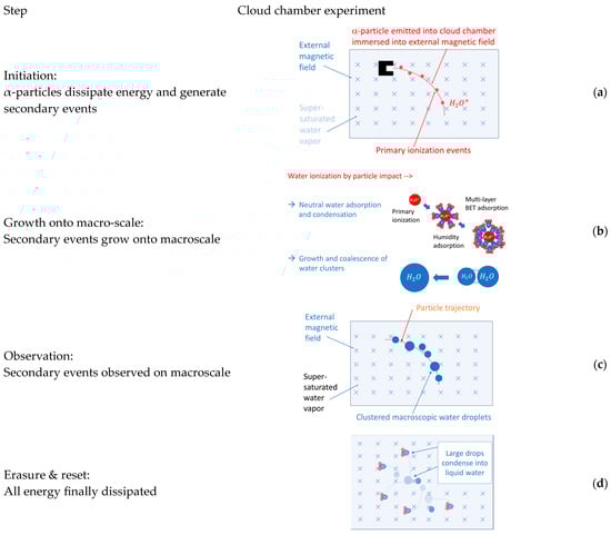 In the cloud chamber experiment shown in Figure 6a, the initiating micro-event is the emission of an α-particle from the source and the ensuing travel of the particle through an atmosphere of supersaturated water vapor inside the cloud chamber. Again, with the high kinetic energy of each emitted α-particle of around , a large number of secondary ionization events is triggered along each particle’s trajectory. Due to the much lower stopping power of α-particles in super-saturated water vapor [30], however, long tracks of ionization events with lengths on the order of several centimeters are formed [8,29].