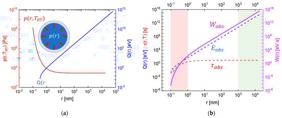 In Figure 7a, the condensation energy of water droplets is drawn as a function of the drop radius together with the internal pressure inside these drops. In Figure 7b, the internal pressure data is redrawn, this time, however, with the vapor pressures being converted into time scales for the evaporation of drops: