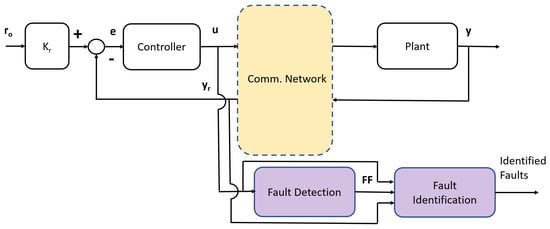 The faults that the control loop might be subject to are involved in the plant model gain, , or the unstable pole . Additionally, due to the NCS nature of the proposed closed control loop in Figure 2, for the fault-identification mechanism we only stipulate that we have access to the signals u and . That is, we only stipulate access to signals on the controller side of the network (otherwise, transmission through a communication channel would be required); see Figure 1.