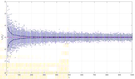 The first step is the selection of L as a compromise between the rejection of the two noise processes and responsiveness to the faults. In Figure 3, we show a Monte Carlo simulation of two hundred simulations of at for each value of L, in steps of ten. The red dashed line is the steady-state predicted value, , and the black dash-dotted lines are the variances of the two hundred simulations at each value of L around the mean value. As predicted, the variance decreases as L increases. From Figure 3, the choice of is considered a good compromise, and it is the value used in the following steps. The proposed selection is compatible with a tolerance value of .