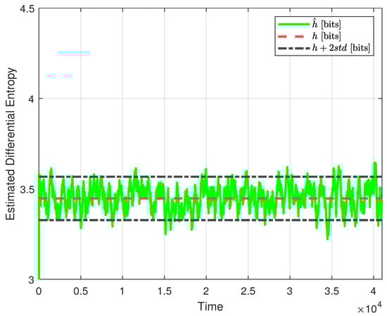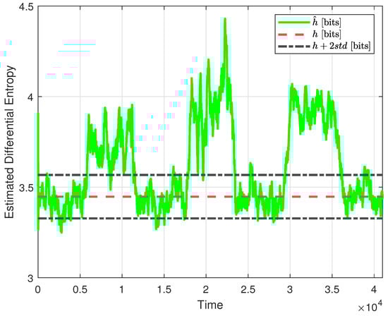 As a second step, focusing on Theorem 2, we provide the estimate (solid green line) and propose from the same figure a choice of that is twice the standard deviation of the observed , which in this case amounts to . Therefore, any increase in the estimated differential entropy, , of more than from the base value, , represented by the red dashed line in Figure 4, is registered as a fault.