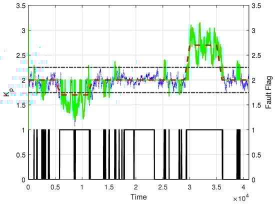Estimated value of the plant gain parameter, , for the selected value of (green solid line), true parameter value (red dashed line), standard deviation (black dash-dotted line), and reported fault flag (black solid line at the bottom).