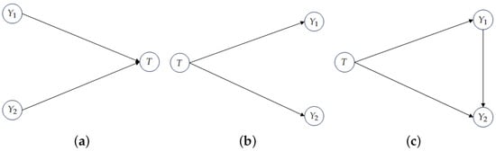 Arguably, the most common scenario in PID is finding out something about the structure of the information the variables have about T. In a particular system of variables characterized by its joint distribution, we do not make causal assumptions, so we can adopt the perspective that the variables are functions of T, hence obtaining the channel structure. Although this channel structure may not be faithful [] to the conditional independence properties implied by , this channel perspective allows for decomposition of and for drawing conclusions about the inner structure of the information that Y has about T. Some distributions, however, cannot have this causal structure. Take, for instance, the distribution generated by , where and are two equiprobable and independent binary random variables. We will call this distribution XOR. For this well-known distribution, we have and , whereas the implied channel distribution that assumes yields the exact opposite dependencies, that is, and ; see Figure 1 for more insight.