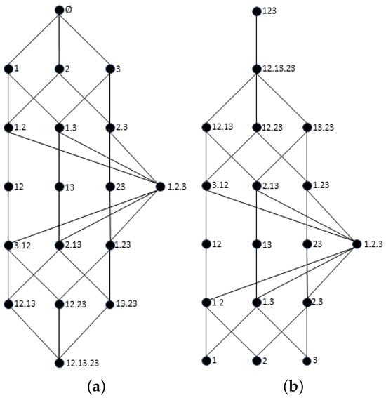 Trivariate distribution lattices and their respective ordering of sources. Left (a): synergy lattice []. Right (b): union information semi-lattice [].