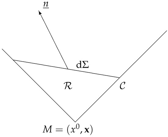 is the portion of the null cone starting at the event and limited by the infinitesimal space-like segment orthogonal to the time-like unit vector . is the region delimited by M, the portion of the light cone , and .