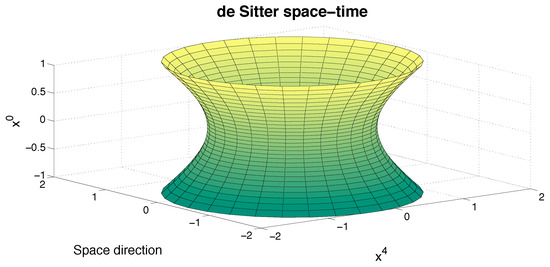The de Sitter space-time can be viewed as a hyperboloid embedded in a five-dimensional Minkowski space with metric diag (see Figure 3). Of course, one should keep in mind that all choices of one point in the manifold as an origin are physically equivalent, as are the points of the Minkowski space-time .