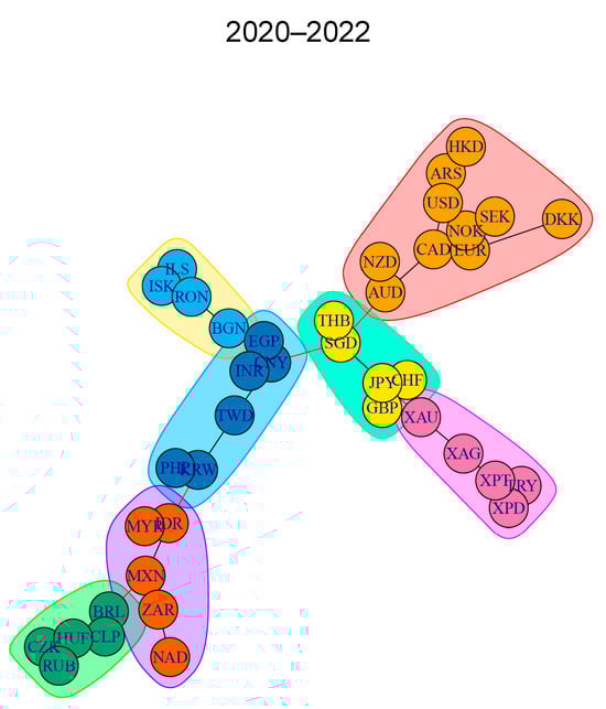 For the 2020 tree (the year of the COVID-19 pandemic outbreak), six groups of currencies were distinguished using the Girvan–Newman method. The most important of them seem to be: (1) a central cluster with NOK, SEK, GBP, JPY, and CHF, (2) a cluster with CAD, KRW, TWD, IDR, MXN, BRL, ZAR, and NAD, (3) a cluster with four metals XPD, XPT, XAG, and XAU, but also with the currencies CZK, HUF, EUR, DKK, and RUB. Noteworthy is the location of the USD, which is far from the network center. In this tree, the highest values for closeness centrality were achieved by the nodes NOK, CAD, RON, XPD, and KRW, and the highest values for betweenness were for NOK, CAD, KRW, RON, and XPD.