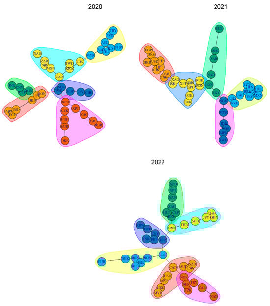 MSTs constructed on the basis of the partial correlation coefficient with the PLN base currency for the years 2020–2022, 2020, 2021, and 2022. Source: authors’ work based on data from stooq.com (accessed on 15 January 2023).