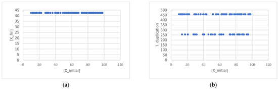 Let us first consider the case of a single linear replicator, whose continuous growth is described by Equation (2). The first interesting observation is that the final concentration tends to develop toward a constant value, the same for every protocell, which depends upon the values of the ratio ηθ/α like in the case of symmetrical division (Section 2). There are now two lifetimes, one for the protocells that were born small, and one for those that were born large. It is interesting that, after 75 generations, the values of the final concentration [Xfin] and of the lifetime Tduplication are the same, irrespective of the value of the concentration of the progenitor cell (provided of course that the other parameters are kept fixed), as shown in Figure 1. In Figure 1, as in all subsequent ones, we show the results of a particular choice of parameters. We ran simulations using a wide variety of parameter combinations, (in particular, varying the threshold θ several times, and the coupling with the container and the catalysis coefficients by orders of magnitude) always obtaining essentially the same trends.