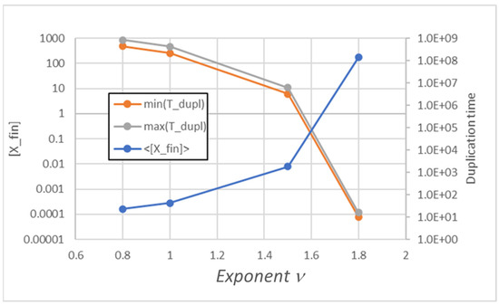 Duplication times Tduplication and replicator concentration at duplication time [Xfin] of a stable population, as ν varies.