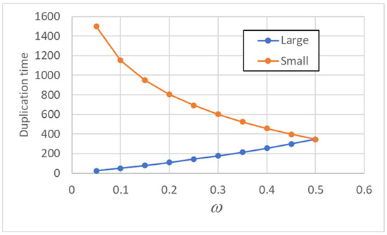 It is also interesting to explore how the variables depend upon the degree of asymmetry, related to the fraction ω. The larger protocells reach the splitting threshold sooner than the smaller ones, and in Figure 3, it is shown how the difference between the duplication times increases as asymmetry increases (linear case).