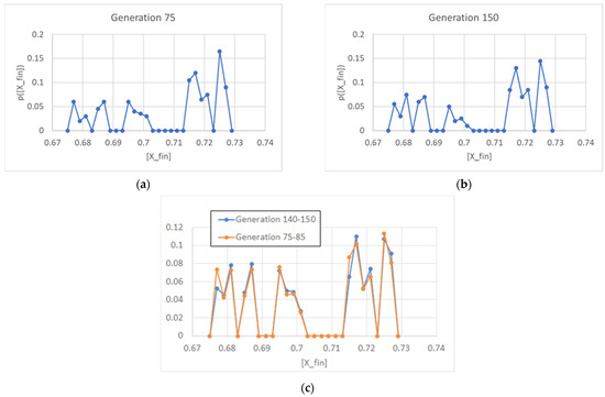 which is identical to Equation (8). If the asymptotic Xfin were the same in different generations, we would come to the same conclusions as in the previous section, but this is not the case. In the case of the linear self-replicator (described by the same Equation (2)), after several generations have passed, we continue to observe a distribution of different final values, contrary to what was observed in SRMs. This distribution (see Figure 4) seems to approach a constant non-obvious shape, where the final values tend to cluster in two groups, with a narrow gap in between.