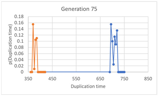Duplication time at the 75th generation (15,000 duplications in a population of 200 individuals, asymmetrical division, ω = 0.4). We have highlighted in different colors two groups, corresponding to the duplication times of protocells born large (small duplication times, in orange color) and protocells born small (large duplication times, in blue color).