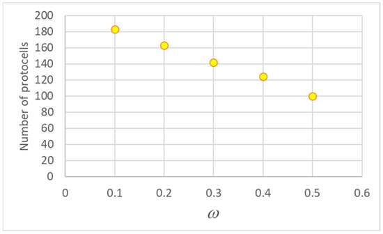 We performed several simulations of protocell populations. For reasons highlighted in Section 1, all these populations start from the asymmetrical division of a mother protocell; the fraction ω is the same at every generation so the impact of its value can be determined (but see Section 5 for a preliminary discussion about the case of a variable threshold). There is a limit Nmax on the maximum number of protocells in the system, so after a transient their total number remains constant (as discussed in Section 1, existing protocells are removed randomly—with uniform distribution—to avoid exceeding that number). When that number has been reached, a generation is defined to be equal to Nmax individual splitting events (i.e., the minimum number that might allow for a complete renewal of the population).