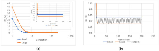 (a) Final concentration of X across generations, for the pure “large protocells only” and the pure “small protocells only” lineages (in the insert a magnification in linear scale). (b) Final concentration of X across generations of the two pure lineages, and of a lineage in which at each duplication only one randomly chosen protocell was followed. It can be noted that the concentration of protocells belonging to this “mixed” lineage, as the generations vary, varies between the extremes constituted by the concentrations of the “pure” lineage.