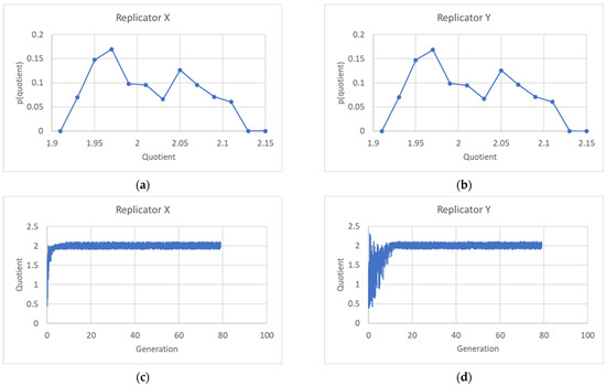 (a) Distribution of the ratio between the sum of the quantities of X of two “sister” protocells and the quantity of replicator X of the “mother” protocell at the 75th generation. (b) The same for the Y replicator. (c) Time trend of the ratio for the X replicator. (d) Time trend of the ratio for the Y replicator. In each protocell in (c,d), the ratio between the quantities of replicators is given by the corresponding ratios in the eigenvalue of the system.