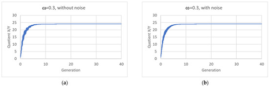 Ratio X/Y with the passing of generations, two linear replicators: (a) noise-free asymmetric division, ω = 0.3; (b) asymmetric division with noise (ω = 0.3 ± 0.1, with uniform distribution). In both plots, the quotient reaches exactly the ratio present in the eigenvector of the system (k11 = 5 × 10−3; k12 = 2 × 10−6; k21 = 2 × 10−4; k22 = 2 × 10−4; ratio= 24.0002).