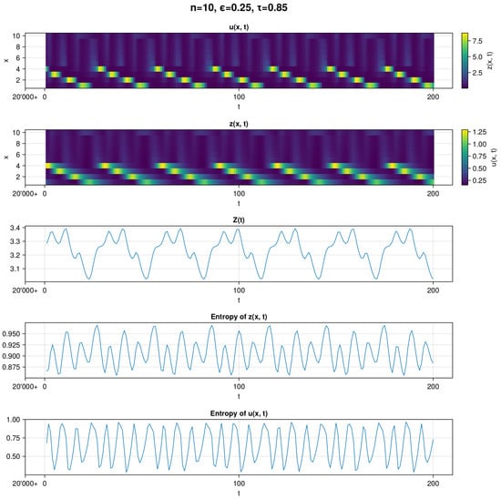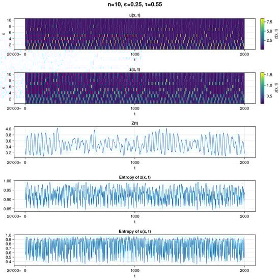 In Figure 1, we can see a visualization of the simulation in which the MLE and autocorrelation indicate a chaotic regime. In the top two subplots, we can see visualizations of the raw u and z data. The absence of clear recurrent patterns is a visual indicator for chaotic behavior (in Figure 2, we see also that for the chosen parameter values, we have positive Lyapunov exponents). This is also apparent for the three bottom subplots, which show aggregate Z, entropy of z, and entropy of u. We can see that Z exhibits a deviation in values within ∼. Entropy of u exhibit a greater range of fluctuations than entropy of z. This might be due to the fact that u does not translate to the values of z as the nonuniform function is used. Nevertheless, there is little noticeable order in the timelines.