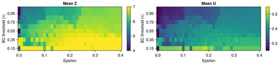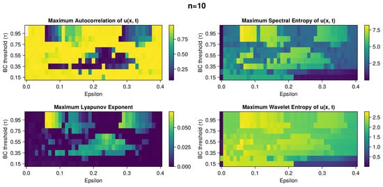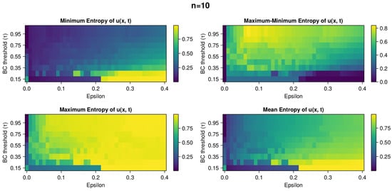 In Figure 5, there is a panel picture with four heatmaps with statistical properties of entropy of u: minimum entropy, maximum entropy, range length of entropy (difference of maximum and minimum value), and mean entropy. We can see that the larger the BC threshold, the larger the oscillations in the opinion range. For high epsilon and low BC, we have a very consistent and narrow opinion distribution. The highest oscillations in entropy match with the highest MLE in Figure 2.