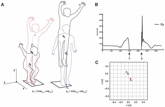Conceptual diagram of experimental set up and primary data obtained from force plate. (A) A typical example of sinking (solid black line) to takeoff (red wavy line) (left) and staying in the air (solid black line) to landing (blue wavy line) (right). The coordinates of the point of takeoff (pt1) and landing (pt2) are computed from the cop data. (B) A typical example of force data (Fy) obtained from a force plate. While not in contact with the force plate (i.e., in air), the value is zero. (C) Typical x-z plane coordinates of the takeoff and landing points. The origin is the initial value (the value at the point of rest, p0).