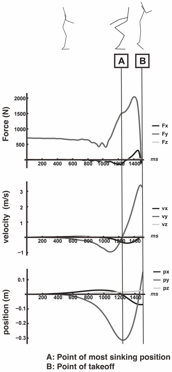 A typical example of analyzed data (above: each component of 3D force, middle: each component of 3D velocity, and below: each component of 3D position). A typical example of each variable used in the analysis. The most vertical sink point (A, t0) and takeoff point (B, t1) were calculated as the characteristic points common to all trials.