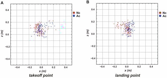 Figure 3 shows the two-dimensional coordinates (x-z plane) of the center of gravity at landing and takeoff. To quantify the variation in these coordinates, entropy was calculated using the method described in previous studies [,]. Consequently, the values at the time of landing were lower under the adjusted condition than under the normal condition (landing—Nc: 2.63; Ac: 2.49). In addition, when comparing the values at takeoff and landing, the values from takeoff to landing were smaller under the adjusted condition than under normal condition (takeoff—Nc: 2.69; Ac: 2.68). The entropy of the 3D velocity vector at the takeoff point was lower in the adjusted condition than in the normal condition (Nc: 5.94; Ac: 5.69).