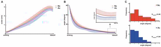 The performance variables for each condition. All of the performance variables for each condition contained data from 100 trials. (A) The mount of velocity scalar from the most vertical sink point to the takeoff point (red: normal condition, mean + SD; blue: adjusted condition, mean − SD). (B) The angle of deviation from the most vertical sink point to the takeoff point (red: normal condition, mean + SD; blue: adjusted condition, mean − SD). (C) A histogram of the angle at the takeoff point (red: normal condition; blue: adjusted condition). In the Ac, the values were clustered around 0° compared with the Nc. When entropy was calculated for a bin width of 1°, the value was smaller for Ac than for Nc.