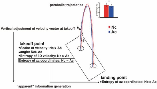 Figure 5 shows a conceptual diagram based on the parameters of the conditions calculated from the actual analysis, which may influence the adjustment of the landing point in a vertical jump. The diagram demonstrates that the trajectories, represented by wavy lines leading up to the landing point, are determined by the initial velocity vectors at takeoff. The modification of the landing trajectory is reflected in the difference between the entropy at takeoff and the entropy at landing, computed as “apparent” information generation. As mentioned previously, entropy reduction in hand movements can be achieved using feedback control from the latter half of the trajectory to capture the target accurately. However, the center of gravity becomes a parabolic trajectory after takeoff, and such feedback control is not available. Thus, the trajectory is predetermined in a feedforward manner by setting the initial velocity direction at takeoff, enabling adjustment of the landing point. Thus, the application of entropy analysis to movement analysis is very effective for quantifying information processing during movement. Notably, this control process is evaluated as “apparent” information generation during the aerial phase.