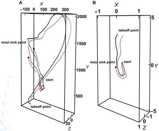 The amount of scalar (, Equation (8)) was calculated from the time-series 3D velocity vector data from the most vertical sink point ( in Figure 2) to the takeoff point ( in Figure 2). To calculate the angle of deviation from the most vertical sink point () to the takeoff point (, which is the inner product of the v vector and the k vector, Equation (9) can be used.