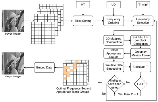 The framework of the proposed method and its constituent processes are delineated in this section. The methodology primarily comprises two elements: dynamic frequency selection and block-based influential metrics analysis followed by grouping. Initially, we iteratively select frequencies with the help of payload and offset. NZACPs are then constructed within each block based on the frequencies identified in the initial phase. Subsequently, we estimate the ED and FSI resulting from the alteration of these coefficients. Blocks are grouped and sorted based on these two metrics, with suitable clusters of blocks being earmarked for data embedding. The comprehensive method is depicted in Figure 1.
