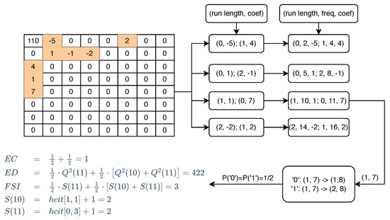 Figure 3 illustrates a random block for computation. Initial processing involves a zigzag traversal of this block to distill the non-zero coefficients, concurrently documenting their run lengths. Subsequently, we pair two adjacent non-zero coefficients. Take the third coefficient pair as an example. This coefficient pair corresponds to Type B, i.e., it pans one unit horizontally or vertically or one unit diagonally depending on the secret data to be embedded. Predicated on the trajectory of the movement, we can deduce its EC, and when amalgamated with the principles from Equations (9) and (18), we are equipped to compute the ED and FSI. Thus, for each block , we are capable of calculating its respective .