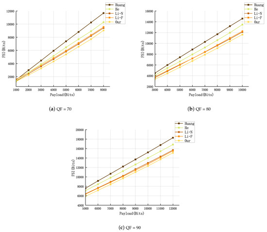 To furnish additional insights, we expanded our experimental regimen to encompass the BOSSbase v1.01 database, thus affirming the wide applicability and robustness of our proposed scheme. A set of 50 images was arbitrarily chosen from the database for testing. All experimental images underwent conversion to JPEG format using three QFs (70, 80, 90), and eight different payloads were used to evaluate the corresponding performances. Comparative experiments were conducted against three established schemes: Huang [7], He [17], Li-N [11], Li-F [12], focusing on PSNR and FSI. The findings from these experiments are exhibited in Figure 4 and Figure 5.
