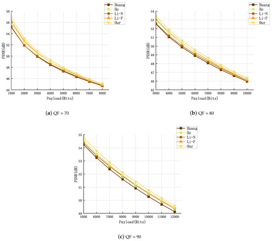 From Table 2 and Table 3, it can be observed that our method is also superior to several existing methods of the same kind in various aspects. For FSI, our method consistently has better performances. At a QF of 80 for 6000 bits, our FSI values are 6376 bits for Lena, 5912 bits for Peppers, 5528 bits for Tiffany, 7368 bits for Goldhill, and 5640 bits for Splash. These figures are lower when compared to the other two methods. In the context of PSNR, our method also shows a clear advantage. At a QF of 70 for 6000 bits, our PSNR values are 47.281 dB for Lena, 48.030 dB for Peppers, 47.897 dB for Tiffany, 46.082 dB for Goldhill, and 48.298 dB for Splash, surpassing the corresponding figures from the other two methods.