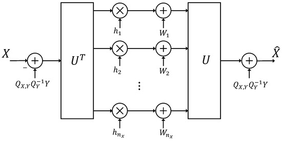 Then, the conditional covariance , which appears in , can be computed from (27). Using Singular Value Decomposition (SVD), we can calculate the eigenvalues of . For this case, the eigenvalues of the conditional covariance are . Similarly, the eigenvalues of can be determined. Finally, the eigenvalues of and are passed to the water-filling to compute the and , respectively.