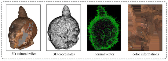 In order to acquire a high-precision 3D model of a cultural relic with realistic texture, it is essential to remove noise from the raw 3D point cloud. The noise in the point cloud can be divided into two categories based on their distribution: surface noise and outliers [2]. Each outlier will usually be far away from the surface of the point cloud with a sparse neighborhood, which means that they are easy to remove using methods such as the boxplot method or special software. However, eliminating surface noise presents a greater challenge as it is often closely intertwined with the underlying surface of the 3D point cloud. This is especially true when the surface of the 3D point cloud features texture and ornamentation.