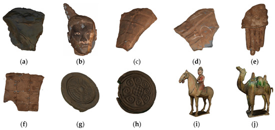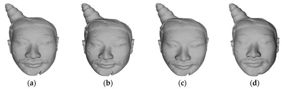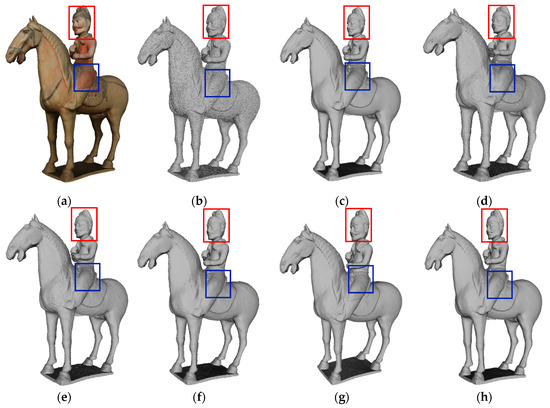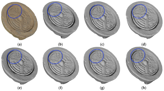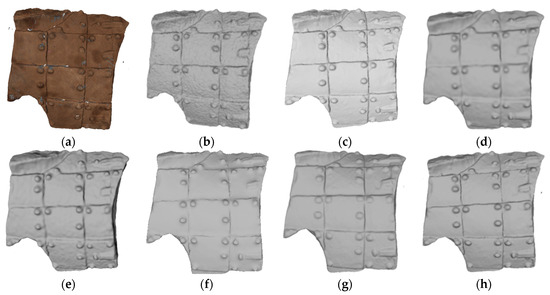 The method proposed in [24] successfully eliminates surface noise while preserving the surface decoration of cultural relics, as shown in Figure 12h. In particular, our denoising method ensures the clear visibility of the rivets on the armor and achieves a satisfactory smoothing effect on the model surface, as shown in Figure 12c. The resulting 3D model, after noise removal, closely resembles the real cultural relic.