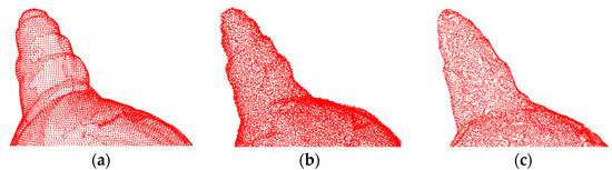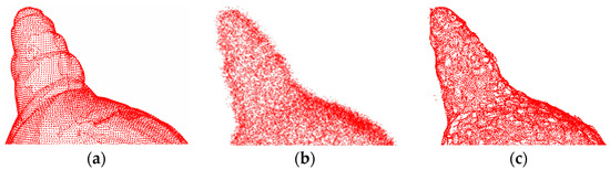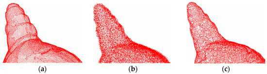 where denotes the 3D coordinates of the point cloud with added noise, denotes the 3D coordinates of the clean point cloud, and denotes the white Gaussian noise (AWGN) [50] that appears near the underlying surface. The AWGN has zero mean and standard deviation.