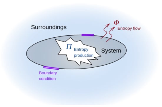 where is the entropy production due to irreversible processes occurring inside the system and is the entropy flux from the system to the environment. Figure 2 shows a system subject to some boundary conditions to avoid matter exchange (i.e., a closed system). The system produces entropy and exchanges entropy with the environment (hence, it shares energy). Specifically, () when the entropy flows from the system (environment) to the environment (system). A system with a minimum entropy production produces the highest amount of free energy (useful work) [21,57]. We refer the reader to [58,59] for a complete review of thermodynamics. In a first-order linear stochastic differential equation, the value of the information rate can be related to and as follows (for further details, see [50]):