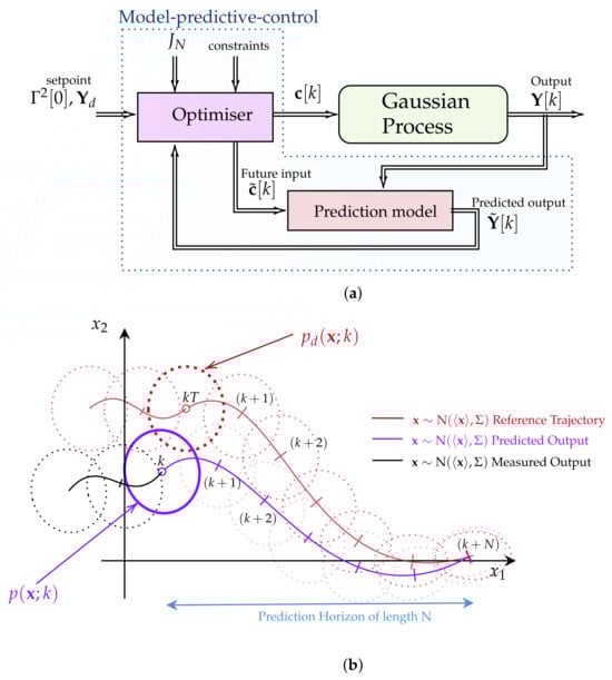 For a clearer grasp of the MPC method’s application in solving the IL-QR problem in real-world scenarios, Figure 3a,b show the control diagram and the functionality of the MPC’s optimiser when considering a second-order stochastic system, respectively.