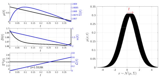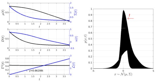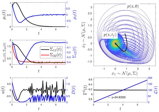 Under conditions almost similar to those in Figure 5, Figure 7 shows the behaviour of the closed-loop system PDF, the states and , and the controls D and u, as well as the behaviour of for . Here, is computed by considering that and . The final state is achieved at approximately . Once again, the geodesic behaviour is supported by the constant value of and the plot of the information length , which depicts a line with a slope of .