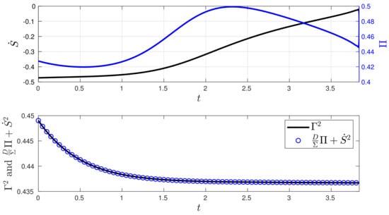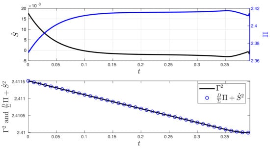 When analysing the stochastic thermodynamics of the O-U system controlled by the MPC technique, Figure 6 presents the plot of the entropy rate in comparison with the entropy production , along with a plot of the value of using Equation (9). The analytical expressions for and , along with their derivations, are given in Appendix C. In the closed-loop system, we can see that the MPC method induces slight changes in both the entropy production and the entropy rate during the process. Since the values of and in the desired state are close to, and far from, their initial conditions at state , respectively, the balance between , and as given by (9) is kept by maintaining an almost constant and a with a nearly constant velocity.