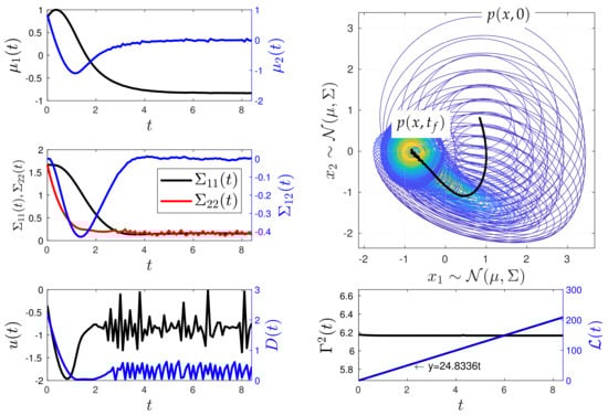 Minimum information variability control of the Kramers equation (Experiment 1). The control effectively adjusts the values of the covariance matrix and the mean vector by dynamically modifying u and D, transitioning the system’s PDF from one state to another out of equilibrium. It is noteworthy that, to maintain the system on the IL’s geodesic, the MPC method maintains a constant , resulting in abrupt changes in u and D as the system approaches the desired state . Physically, this leads to a high entropy production due to the control action.